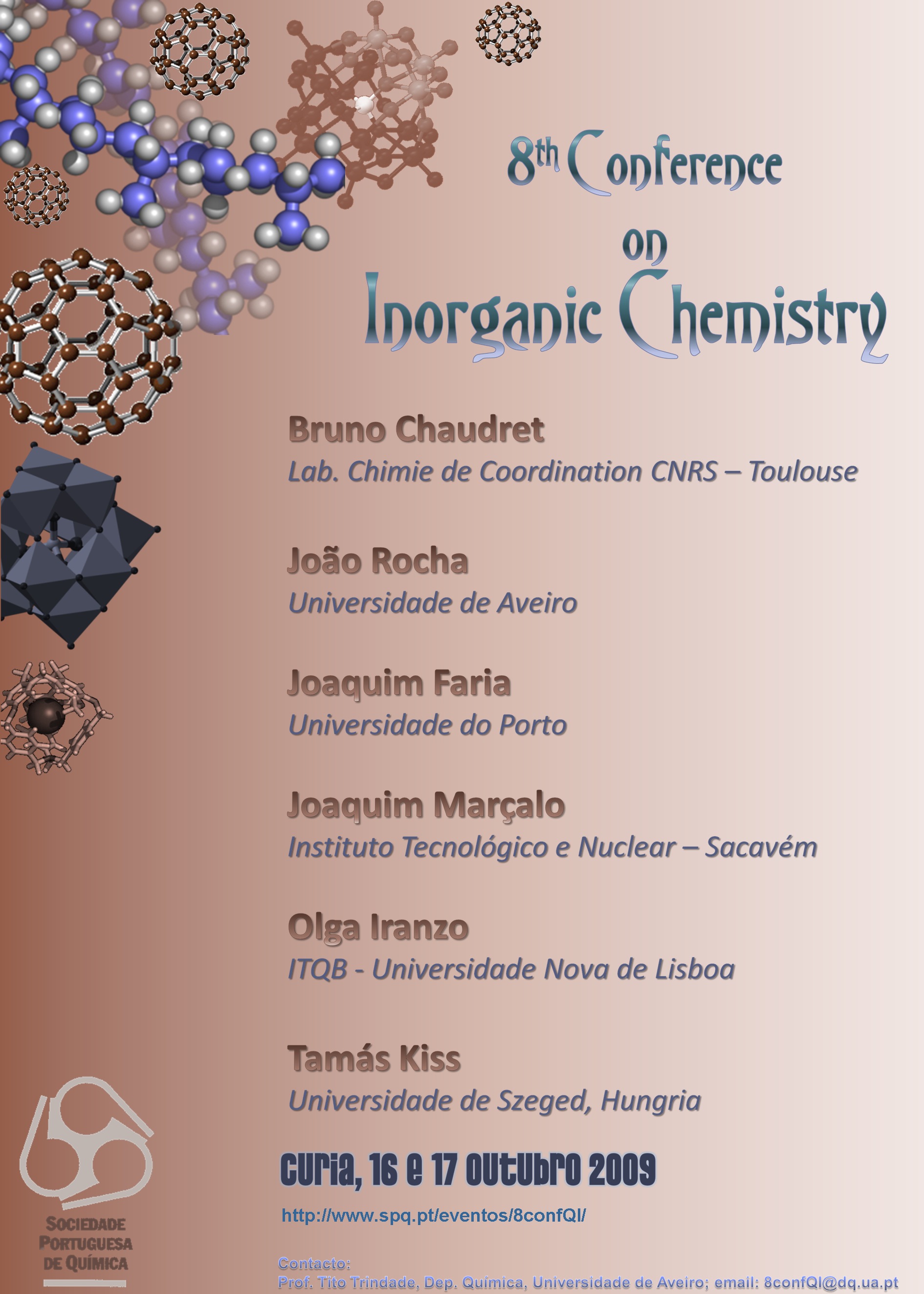 The Inorganic Chemistry Division of the Portuguese Chemical Society (SPQ) invites you to be present in the 8th Conference on Inorganic Chemistry to be held on the 16 and 17 of October 2009, at Curia, located in the heart of the Bairrada region of Portugal.